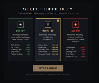 This one needs some work, in order to do the suggested factory production you need to unlock more things that arent available from the start. For Example, to make the basic packaged chip - the first product, you need to etch the silicon 3-8 times, seperate the chips with 3 or more defects, bond with copper wiring, then pack with plastic. You only start with basic belts and an ething machine. Plus the market saturation is an odd choice to have for the beginning of the game when theres only 1 possible product you can make, it ends up with you having to wait 30 secs to continue having fun.